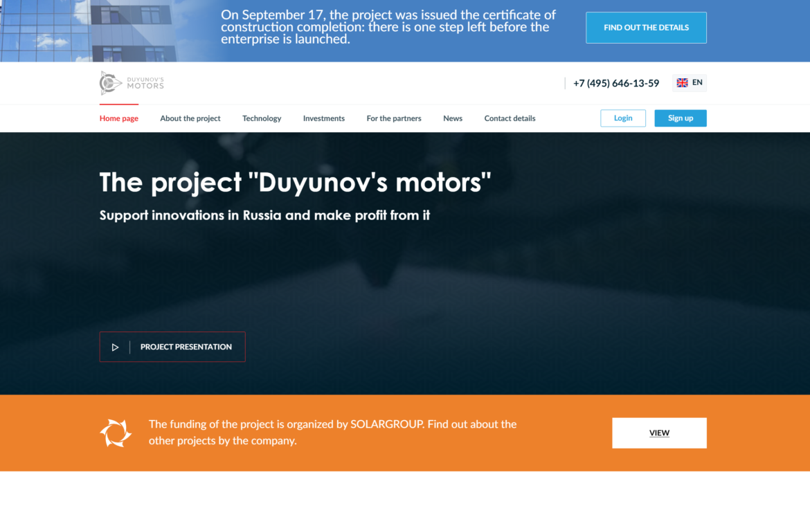 SolarGroup — это международная финансовая компания нового поколения, использующая модель народного финансирования (crowdinvesting). Основным вектором деятельности на протяжении последних лет является проект «Моторы Дуюнова», нацеленный на коммерциализацию технологии совмещенных обмоток «Славянка».
